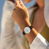 薄型のスチールケースとイタリア製レザーストラップは1つのリンクで繋がり、ブレスレットのような着用感です。
