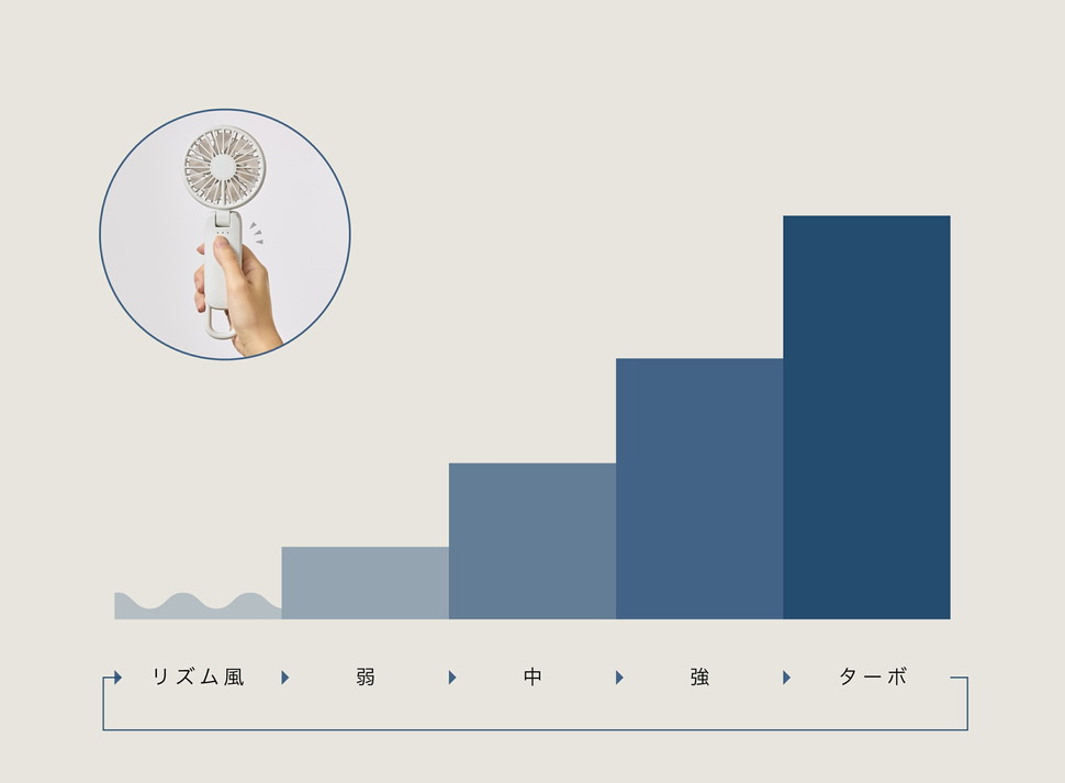電源のON/OFFをはさむことなく、ボタン単押しで5段階の風量調節が可能です。