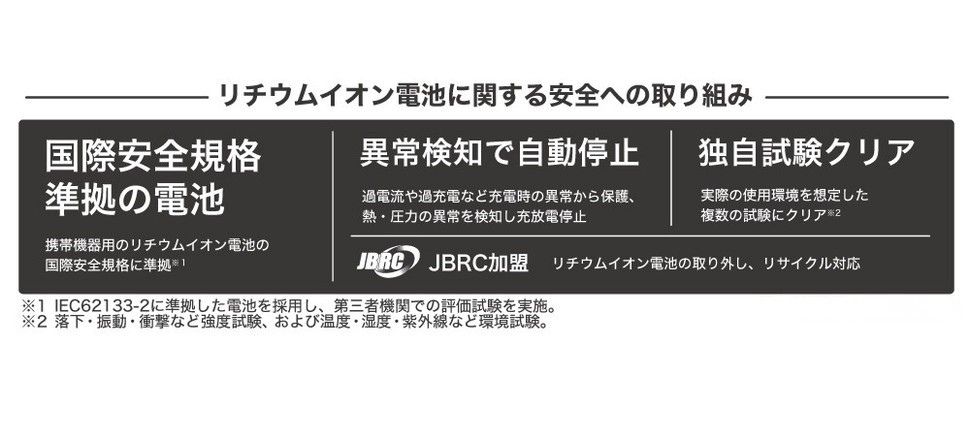 当社のリチウムイオン電池内蔵製品は、国際規格に準拠したリチウムイオン電池を採用し、