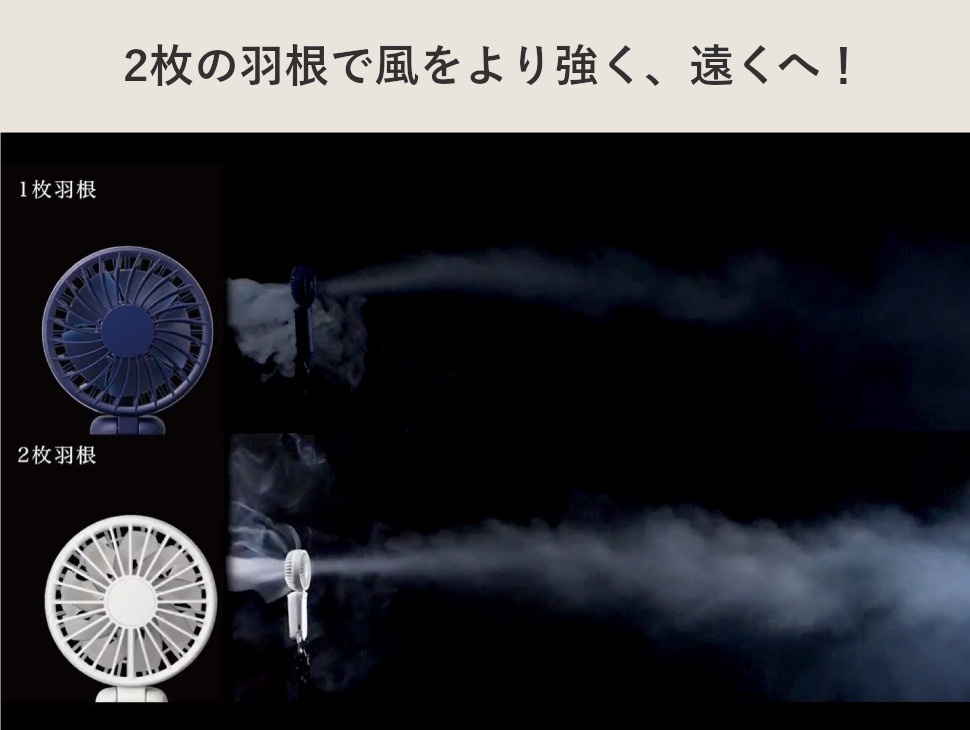 2枚の羽根が逆方向に回転することで、風のロスを抑え、まっすぐ遠くまで風を届けます。