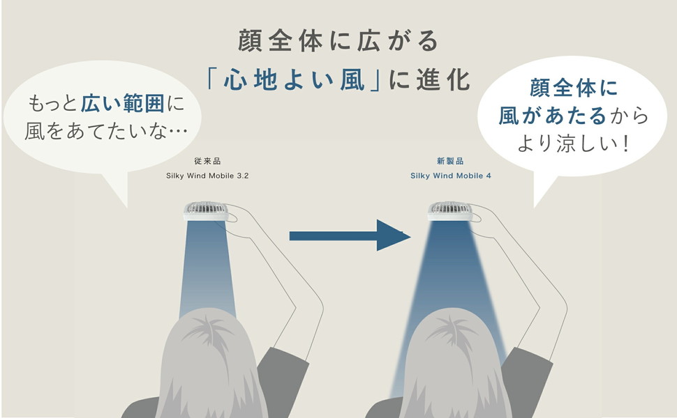 パワフルな風量はそのままに、直線的だった風を、顔全体に広がる風質へ。