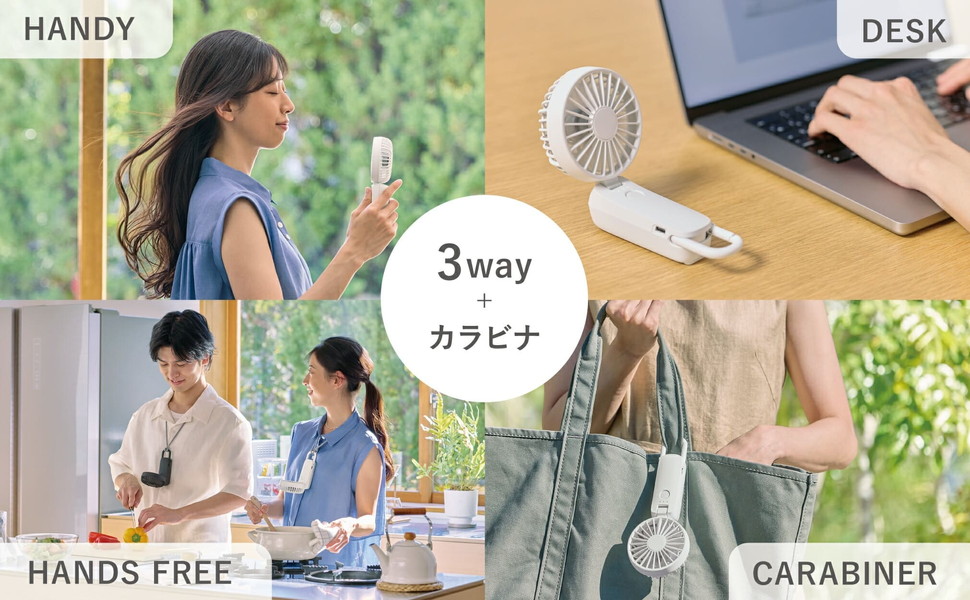 ハンディーはもちろん、デスクファンや付属のストラップでハンズフリーでも使える3way。