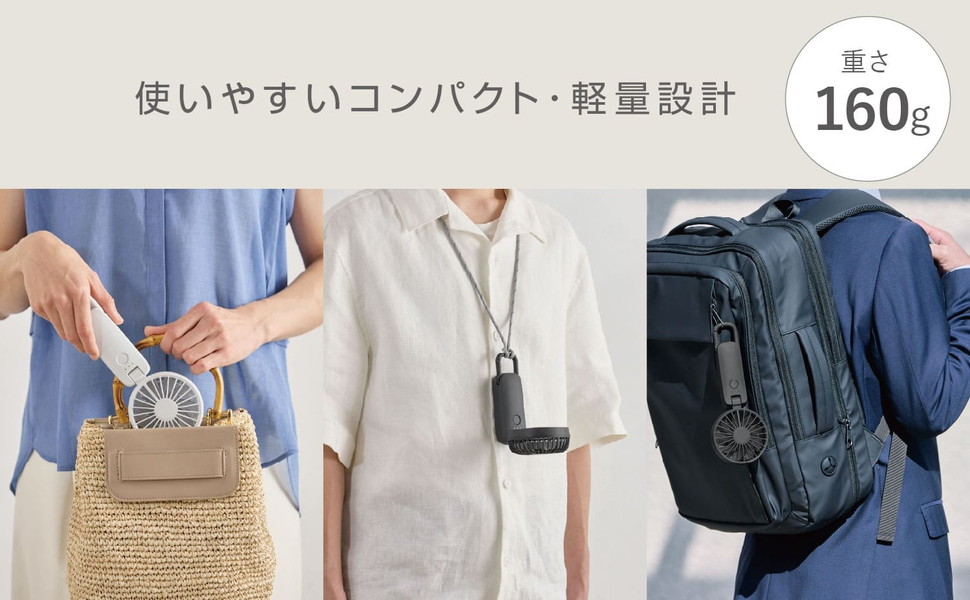 約160gの軽量ボディで、首から下げたり、カバンに取り付けた状態でも負担になりにくい重さ。