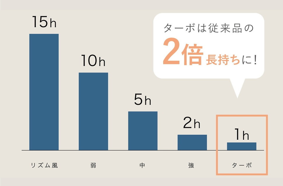 リズム風で15時間、弱モードでもたっぷり10時間稼働するので、日中の暑さもこれ1つでフルカバー。